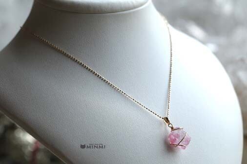 宝石質ピンクルピネル原石18kワイヤーアートペンダント
